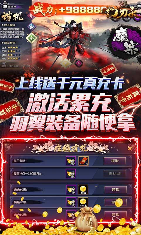 《幻刃录(送大额真充卡)》是一款以盘古开天后人妖仙魔九界共存为背景的古神话题材ARPG,丰富的剧情,极具代入感的故事背景开启古神话世界,该游戏为全新重置版,经典与创新的结合玩法,新增充值卡活动让你在游戏中征战古神豪不费力。★每日上线领真充抽奖券★升级送充值★BOSS爆充值。一切为了增强您的游戏体验,玩游戏根本不用花钱。快来感受中国特色的古神世界。