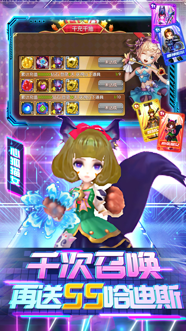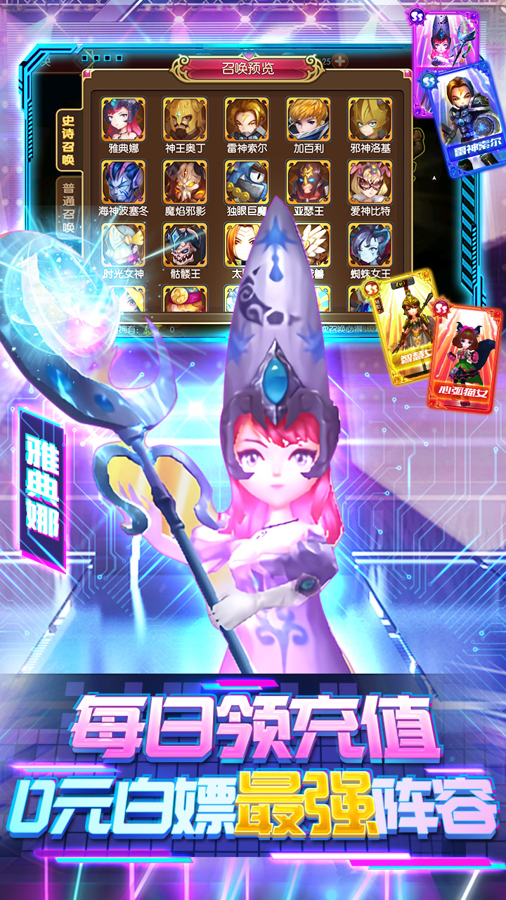 背景为诸神战争,玩家可以在游戏中收集大量熟悉的神话英雄, 神话英雄分为六大职业,攻击方式、攻击属性完全不一样,前后两排6V6的PK,玩家可以根据不同的对抗来使用相对应的布阵策略。上线游戏过程中我们将会送出千元充值以及千次抽卡的机会,让玩家更加 自由的搭配多种英雄、契约法术,华丽的震动特效,即时释放,助你开启属于自己的诸神纪元。