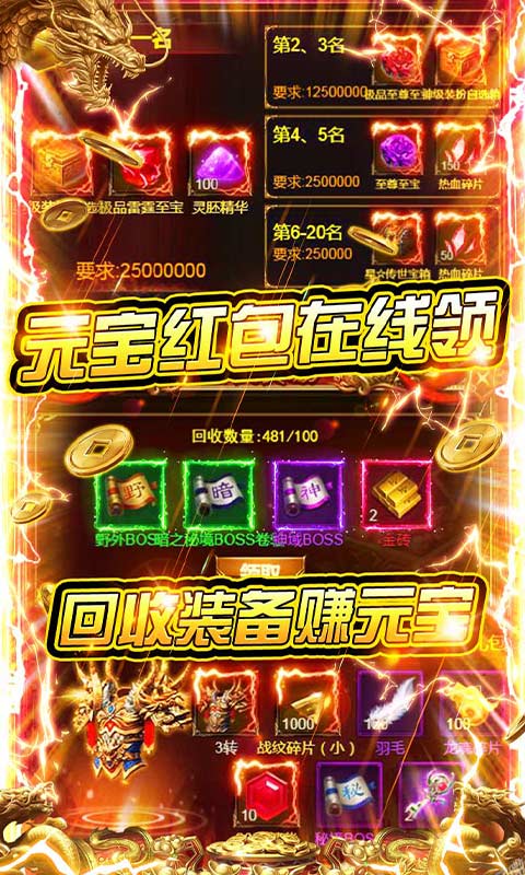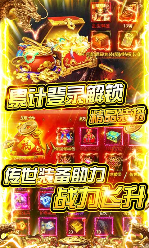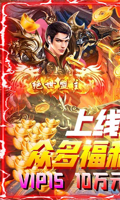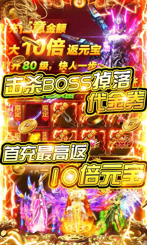 上线就送万元充值券、VIP15、10W元宝!无上限福利活动,让你白嫖到老! 充值任意金额最高10倍元宝返利,直升80级,豪送限定时装再送传世装备。 VIP礼包免费领,野外BOOS掉落代金券,回收装备也能返元宝。带上兄弟一起玩,争做龙城霸主! 庆典返利,超值投资,1元豪礼....诚意满满,活动丰富奖励领不停~ 酷炫时装,助你升战一到9999,经典传奇玩法,带你梦回沙巴克;全新合击系统,尽情享受PK乐趣。传奇不等待,要爽就现在!